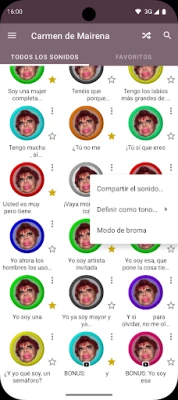 A parte de reproducirlas, también podrás hacer todo esto: • Definir un conjunto de frases favoritas para acceder a ellas más rápidamente. • Definirlas como tono de notificación, teléfono, alarma o contacto. • Enviarlas por WhatsApp, Telegram, correo o MMS. • Añadir frases como widgets en el escritorio. • Ver los vídeos de YouTube de algunas de las frases. • Reproducir sonidos aleatoriamente.